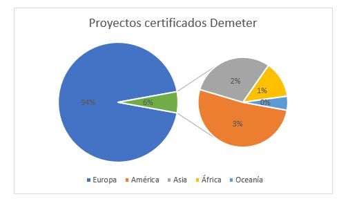 La certificación Demeter es solicitada por muchos países de Europa, las empresas, brokers y cadenas de supermercados tienden a buscar más productos certificados bajo esta normativa para comercializarlos en el mercado local. Más del 94% de los proyectos se encuentran certificados en Europa y tan solo el 6% de proyectos se encuentran distribuidos en América, Asía, África y Oceanía.