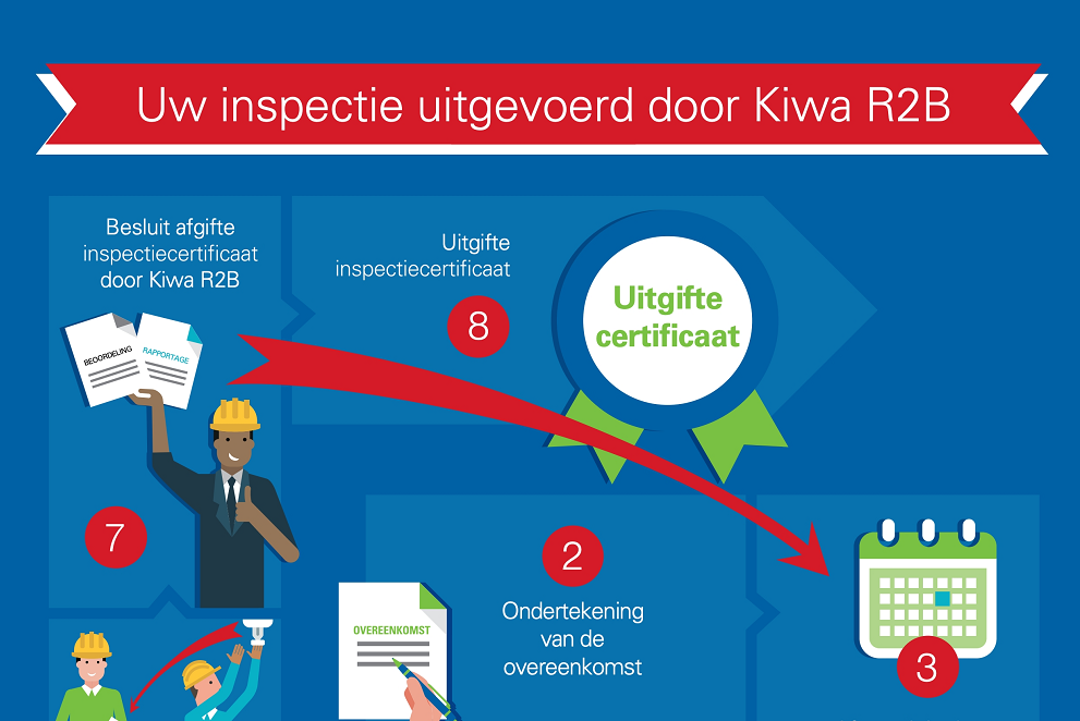 In onze Infographic ‘Uw inspectie uitgevoerd door Kiwa R2B’ kunt u zien welke stappen er doorlopen worden tot de afgifte van het inspectiecertificaat.