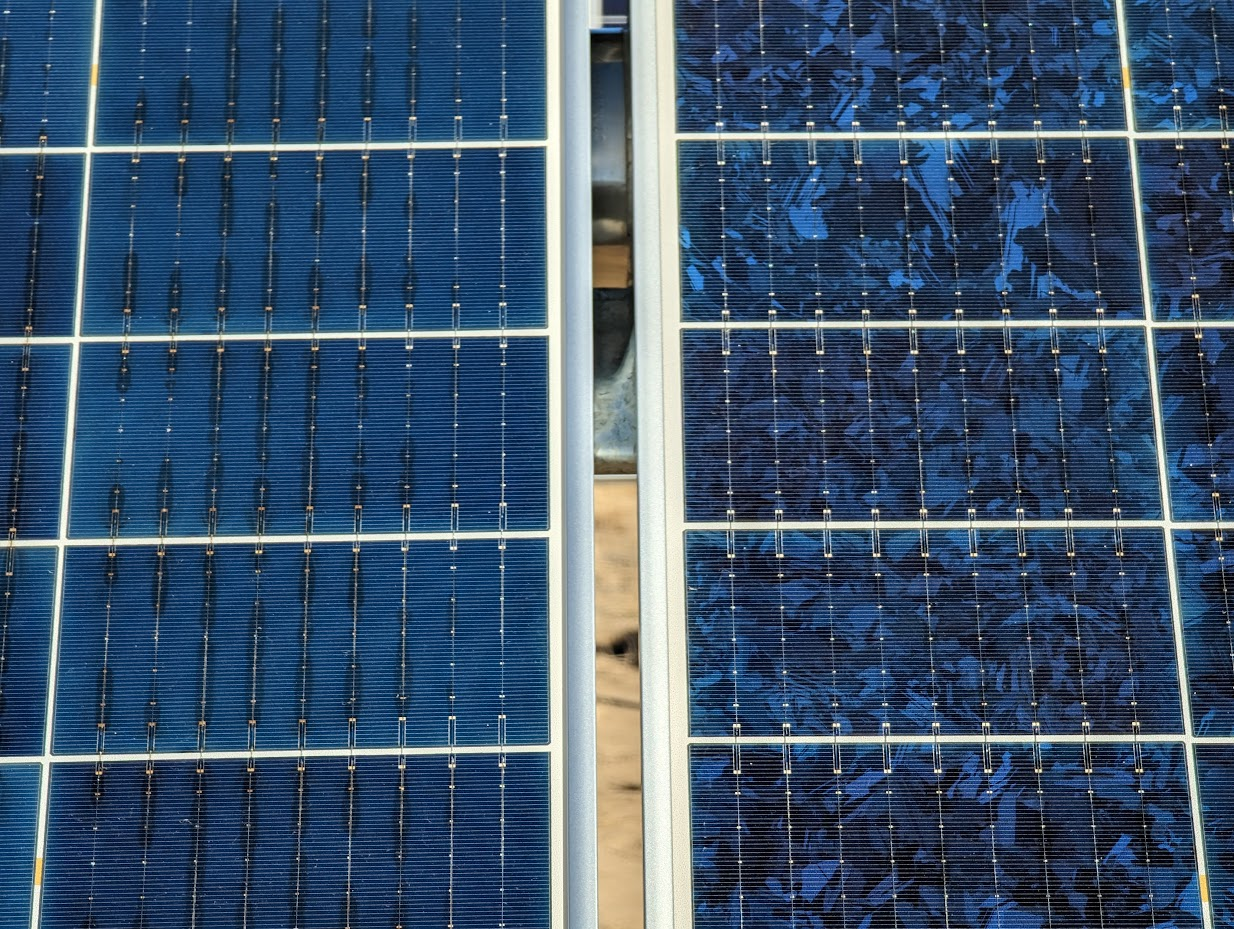 As of 2023, Heliolytics (now part of Zeitview) had conducted 155 GW of aerial scans, which collectively determined that the module model type is indicative but not sufficient for understanding module reliability risks. This example shows two adjacent modules that are the same model type but clearly different cells and likely other BOM components. The module on the right is performing as expected, but the one on the left has evidence of busbar discoloration. This can lead to module-level degradation, as well as differential degradation within the array, thus amplifying mismatch losses and further impacting site performance.